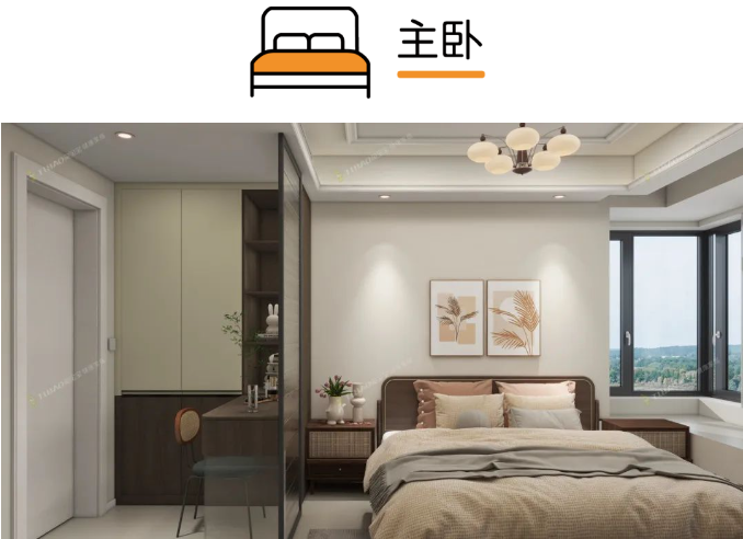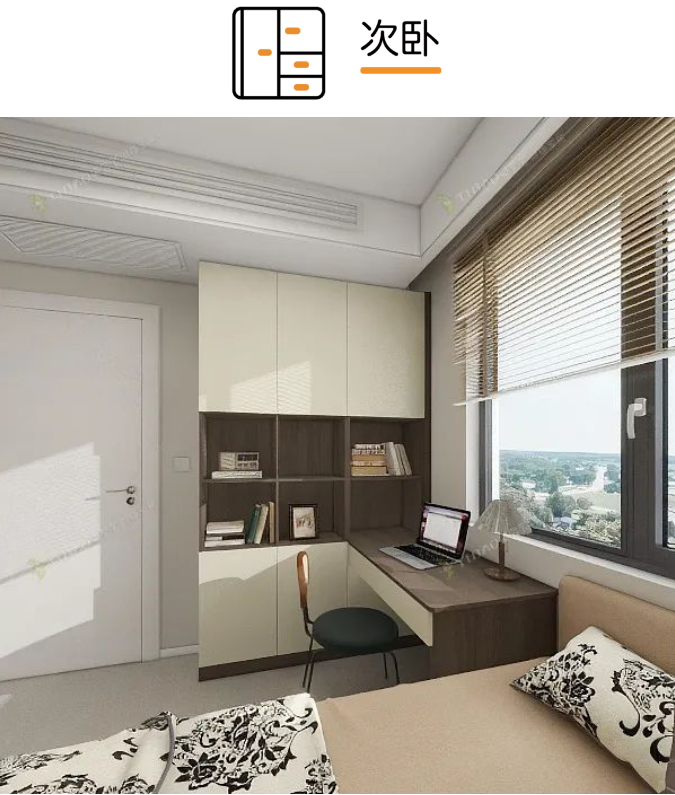 利用書桌、衣柜、床打造“實(shí)用黃金三角”,節(jié)約空間、集中收納、動線合理、實(shí)用高效,不僅可以滿足工作的需求,也能當(dāng)做臥室使用,功能性更強(qiáng)。