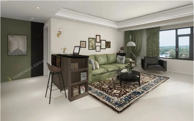 客廳整體以奶白色為主,走進(jìn)休閑區(qū),采用復(fù)古的墨綠色與原木色進(jìn)行撞色搭配,加強(qiáng)不同功能區(qū)的交互,墨綠、奶白、深咖在此交融,呈現(xiàn)出一個精致復(fù)古的溫馨空間。