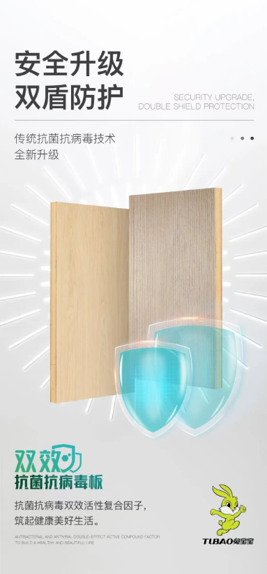 生活中的細(xì)菌、病毒,雖然微不可見,卻無處不在,它悄無聲息地飄散在家中的每一個角落——床頭、衣柜、櫥柜,時刻威脅著家人的健康。特別是在流感高發(fā)季,一旦有家庭成員不幸中招,病毒就可能通過空氣流動或日常接觸迅速擴散,威脅到其他家人的健康。而兔寶寶雙效抗菌抗病毒板材采用了先進的表層植入技術(shù),將雙效活性復(fù)合因子牢固地附著在板材表面,這些因子如同家中的隱形衛(wèi)士,24小時不間斷地守護著家的每一寸空間。