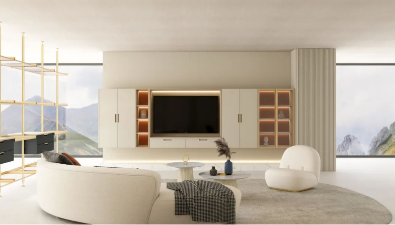 這種設(shè)計以電視為中心,向四周延伸,形成一整面墻的收納系統(tǒng),其收納能力令人嘆為觀止。開放式的展示架如同藝術(shù)品的展示窗,擺放著精美的擺件、書籍與旅行紀(jì)念品,彰顯主人的生活情趣與品味;而封閉式的柜門則像寶藏箱,將影音設(shè)備、雜物等一一隱藏,保持客廳的清爽與整潔。