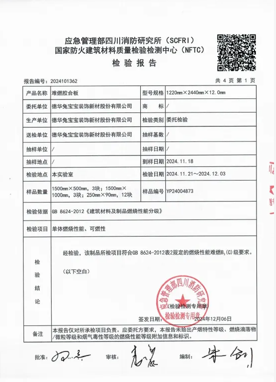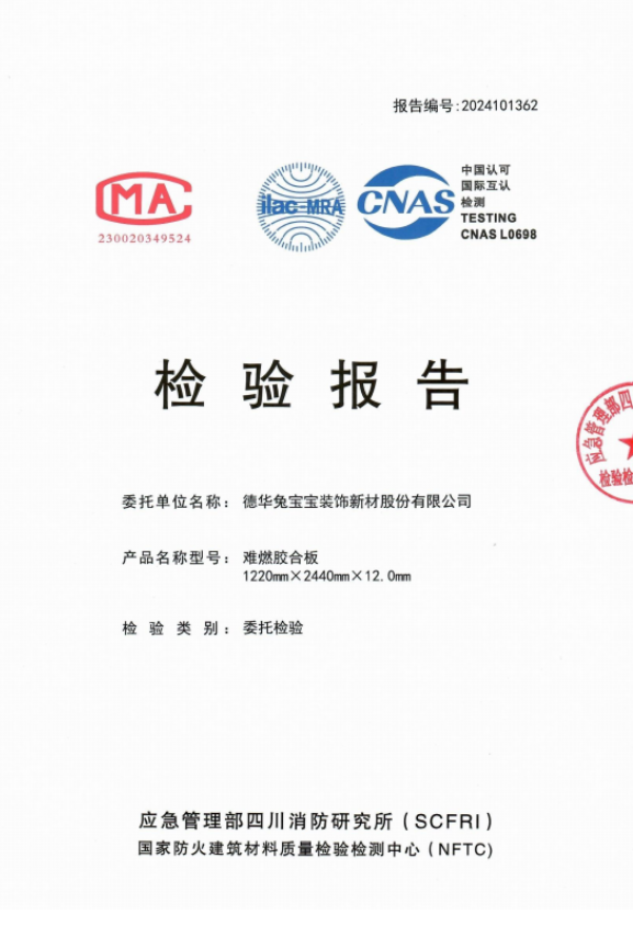 在板材的領(lǐng)域,兔寶寶難燃板始終以“優(yōu)等生”的標(biāo)準(zhǔn)嚴(yán)格要求自己,不僅達(dá)到國家標(biāo)準(zhǔn)GB8624-2012 中B1級難燃標(biāo)準(zhǔn),還堅守“環(huán)保”初心,打造性能與環(huán)保性兼具的產(chǎn)品。除了品質(zhì)至上,兔寶寶更以“透明化”的形式樹立行業(yè)標(biāo)桿。兔寶寶開展了公檢活動,通過現(xiàn)場取樣、權(quán)威機(jī)構(gòu)檢測、檢測結(jié)果公示的全透明流程,構(gòu)建起消費者與品牌之間的信任橋梁。這種對品質(zhì)的底氣與擔(dān)當(dāng),讓每一塊兔寶寶難燃板都成為守護(hù)家庭安全的 “防火墻”。當(dāng)您在裝修時選擇兔寶寶難燃板,不僅是選擇了一份美觀與實用,更是為家人的安全上了雙重保險。