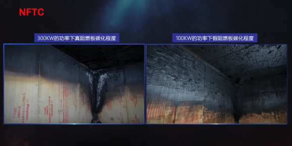 實(shí)驗(yàn)?zāi)M火災(zāi)現(xiàn)場(chǎng),假阻燃板在燃燒7分鐘時(shí),釋放熱量突破500kW,火勢(shì)失控,不得不提前滅火終止實(shí)驗(yàn)。而真阻燃板卻在20分鐘內(nèi)始終保持穩(wěn)定放熱,最終明火迅速熄滅。實(shí)驗(yàn)畫(huà)面中,假阻燃板碳化面積觸目驚心,而真阻燃板表面僅輕微碳化。