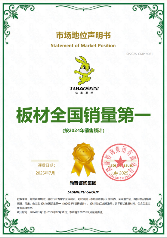 兔寶寶板材全國銷量第一!領(lǐng)跑全國市場!