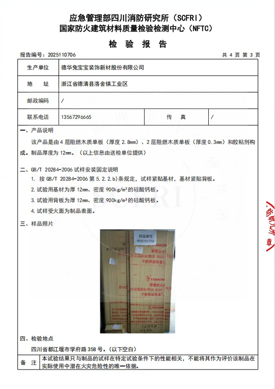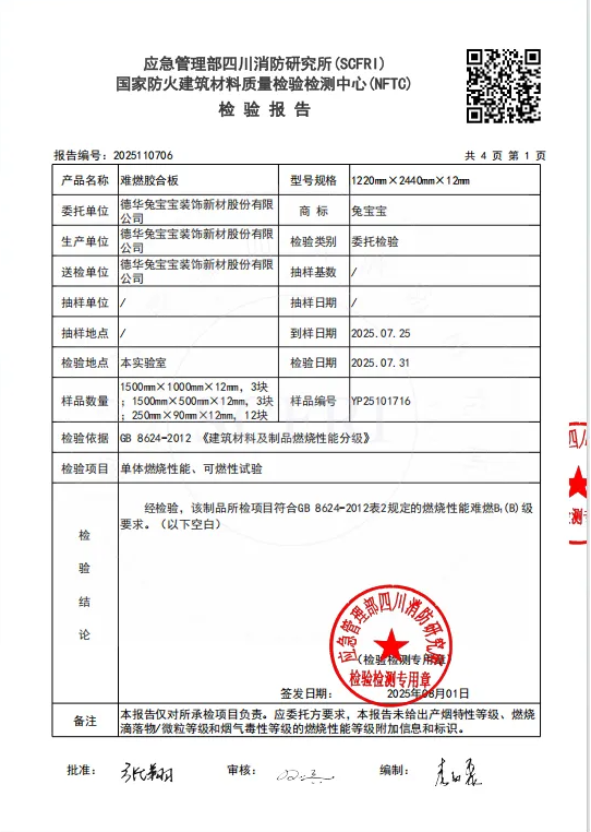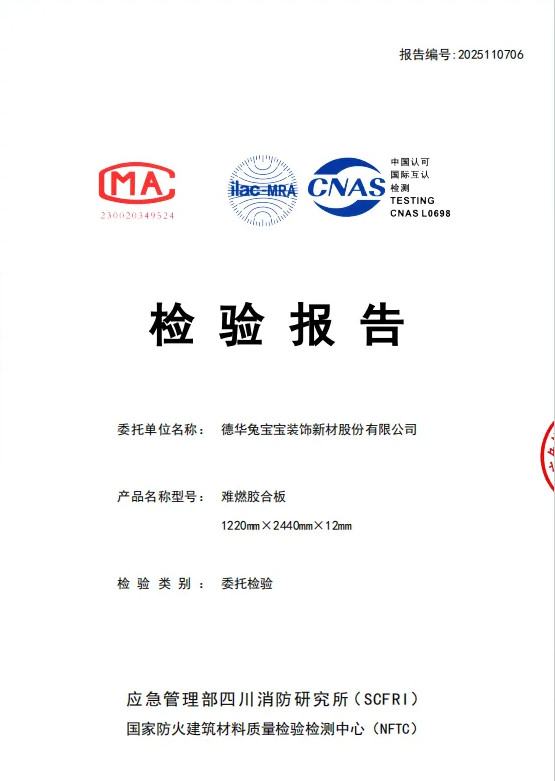 2025年7月21日,“質量安全萬里行”第三站公證檢測走進合肥中國科學院臨床研究醫(yī)院項目,在協會、企業(yè)、新聞媒體等多方見證下,現場抽檢了項目所用的兔寶寶難燃板并送檢。近日,我們已收到國家防火建筑材料質量監(jiān)督檢驗中心與國家人造板與木竹制品質量監(jiān)督檢驗中心的檢測報告?,F正式向社會公布檢測結果,歡迎您的關注與監(jiān)督!