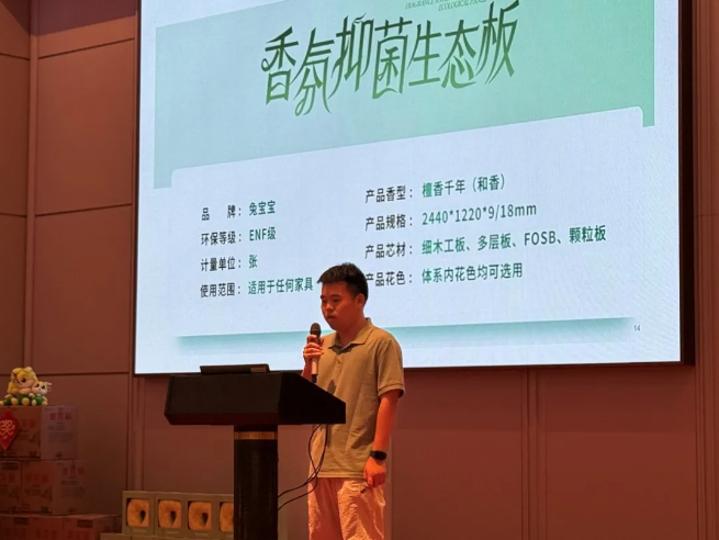 隨后,浙江銷售公司溫州區(qū)域負(fù)責(zé)人汪杰重點(diǎn)介紹了兔寶寶最新研發(fā)的兩款創(chuàng)新產(chǎn)品——香氛抑菌板和雙效抗菌抗病毒板。