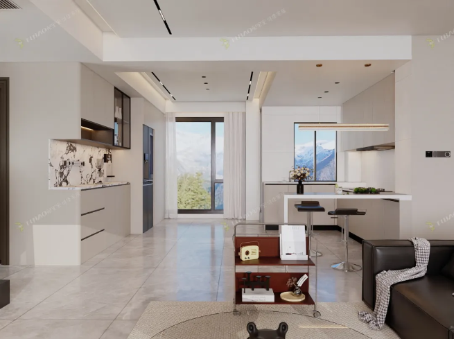 餐廳與廚房采用了開放式設(shè)計(jì),還加入了島臺(tái)元素,讓烹飪與用餐的互動(dòng)更便捷。通過不同材質(zhì)的碰撞,延伸了桌面面積,原本不大的餐廳瞬間擴(kuò)容。廚房區(qū)域的操作區(qū)規(guī)劃得十分高效,洗、切、炒動(dòng)線清晰,讓烹飪過程更順暢。黑白色的餐邊柜簡(jiǎn)潔大氣,與整體風(fēng)格保持一致,并且巧妙地將冰箱嵌入其中,讓家電與柜體融為一體。