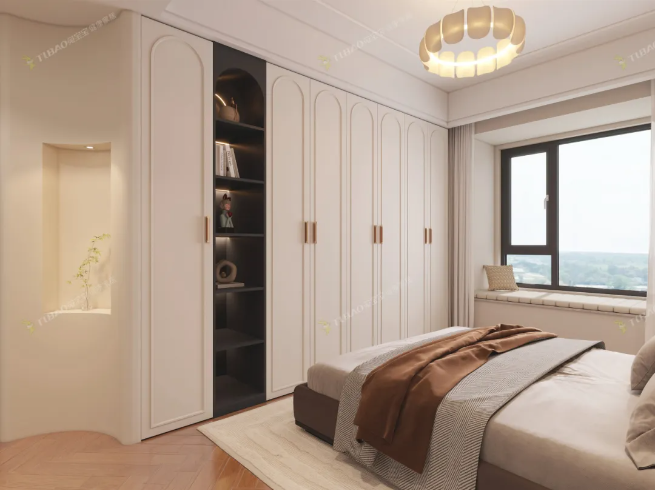 床尾處一面墻做了“一字型”通頂衣柜,充分利用了墻面,內(nèi)部合理劃分出掛衣區(qū)、疊放區(qū)與儲物區(qū),大大增加了臥室的儲物空間,是臥室不會亂的秘訣。
