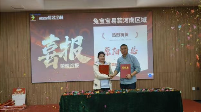 為了進一步擴大河南區(qū)域的經(jīng)銷商隊伍,會議最后,易裝運營公司王總進行了招商會宣導(dǎo)。他詳細介紹了兔寶寶易裝的招商政策、加盟優(yōu)勢和支持體系,吸引了眾多意向經(jīng)銷商的關(guān)注,現(xiàn)場成功簽約7家新客戶。他們紛紛表示,兔寶寶易裝品牌實力雄厚,市場前景廣闊,希望能夠加入兔寶寶易裝大家庭,共同開創(chuàng)財富未來。