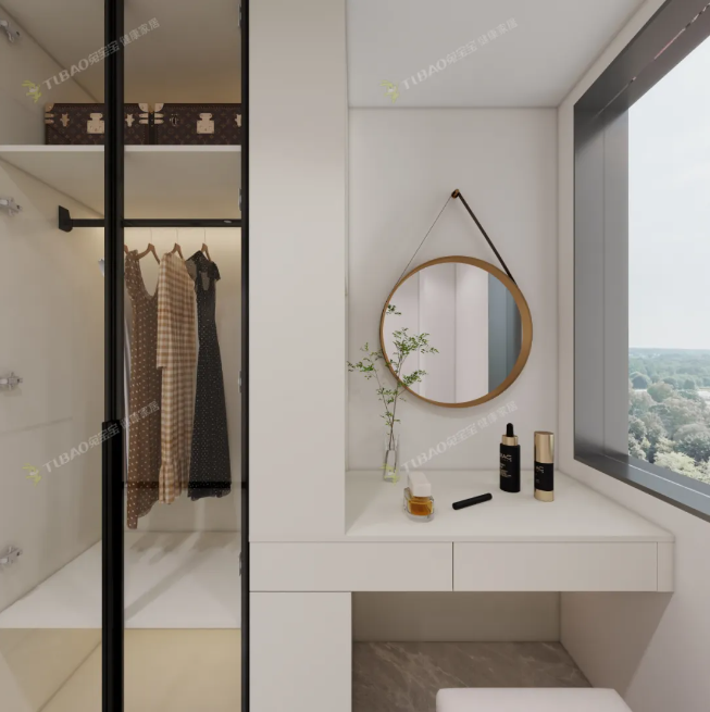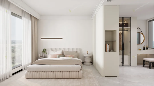 主臥同樣以柔和的淺色調(diào)為主,搭配淺棕色的床品與軟裝,營造出溫馨雅致的睡眠氛圍。寬敞的落地窗將城市景觀盡收眼底,也為室內(nèi)帶來了極佳的采光。雙層窗簾的結(jié)合,可以靈活地調(diào)節(jié)光線與隱私需求。床頭的兩側(cè)是同色系的精致床頭柜,小巧而實(shí)用。最巧妙的是,臥室中央利用一道衣柜作為隔斷,在后方巧妙地劃分出一個(gè)獨(dú)立的梳妝區(qū),讓空間功能更加完善,整體布局通透又具私密性。