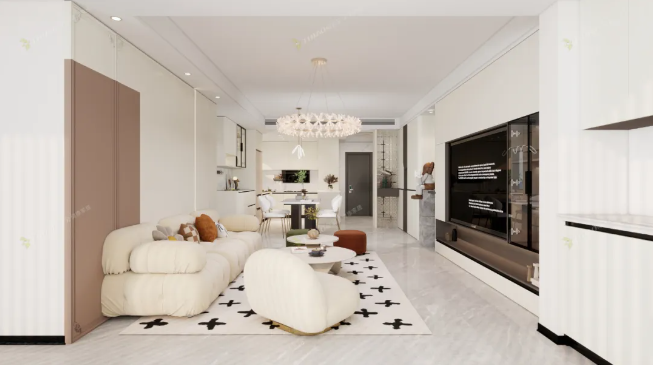 在本案106平方米的空間里,設(shè)計(jì)師以風(fēng)靡一時(shí)的奶油風(fēng)為基調(diào),旨在為居者打造一個(gè)溫馨、柔和且充滿治愈感的居住環(huán)境。整體空間摒棄了繁復(fù)的裝飾與濃烈的色彩,以統(tǒng)一的奶油白色為主色調(diào),從墻面、柜體到地面,營造出渾然一體的和諧感。