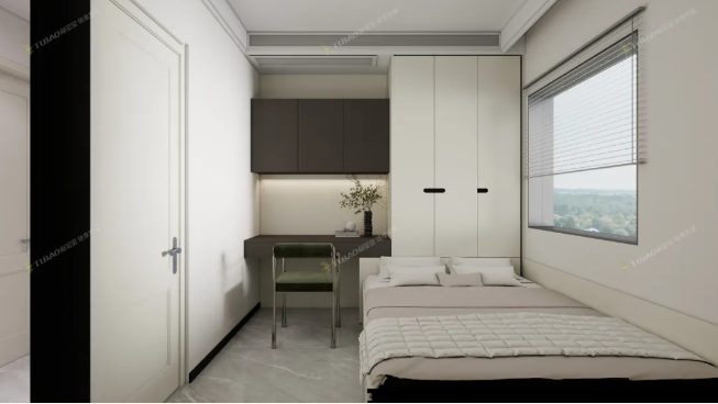 次臥的設(shè)計(jì)充分體現(xiàn)了對(duì)空間的高效利用。其中一間,通過一門到頂?shù)陌咨笠鹿駶M足充足的儲(chǔ)物需求,簡潔的床品搭配淺棕色抱枕,延續(xù)了整體的溫馨感。另一間次臥則采用了更為巧妙的組合設(shè)計(jì),將床頭、衣柜與書桌一體化定制,無縫銜接了休憩與辦公功能,即使在有限的空間里,也能實(shí)現(xiàn)生活品質(zhì)的最大化。