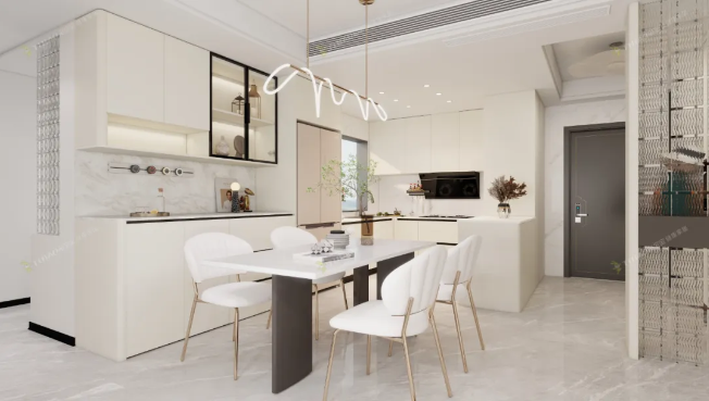 餐廳與開放式廚房相連,延續(xù)了整體的淺色調(diào),視野開闊,光線通透。一張純凈的白色餐桌,搭配著金色細(xì)框座椅,在簡約中透露出精致的優(yōu)雅感。一旁定制的餐邊柜,兼具強(qiáng)大的收納與展示功能;柜體內(nèi)嵌入的暖色燈帶,在開啟的瞬間灑下溫馨的光暈,讓杯盞盤碟也成為了裝飾的一部分,溫暖了日常的每一餐。