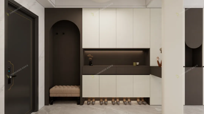 推開家門,首先映入眼簾的是精心設(shè)計(jì)的玄關(guān)柜。奶油白的柜體點(diǎn)綴著咖色,瞬間奠定了空間溫柔而沉穩(wěn)的初印象。換鞋凳上方的掛鉤方便進(jìn)門后隨手掛放外套與帽子,中空區(qū)域讓雨傘、購物袋等小雜物有了安身之處,極大提升了空間的收納能力。底部懸空的設(shè)計(jì),不僅方便通勤時(shí)更換居家鞋,更在視覺上營造出輕盈感。