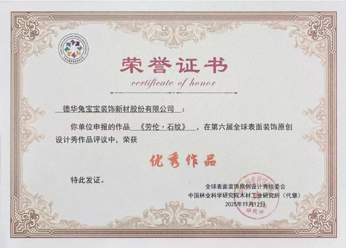 在本次原創(chuàng)設(shè)計秀中,兔寶寶報送的3款花色作品憑借獨特的設(shè)計理念與出眾的工藝呈現(xiàn),全部成功入圍,其中“勞倫·石紋”更是脫穎而出,斬獲“優(yōu)秀作品”榮譽,另外兩款作品《核顏悅色·核桃》《陌上榆影》均獲評“入圍作品”。