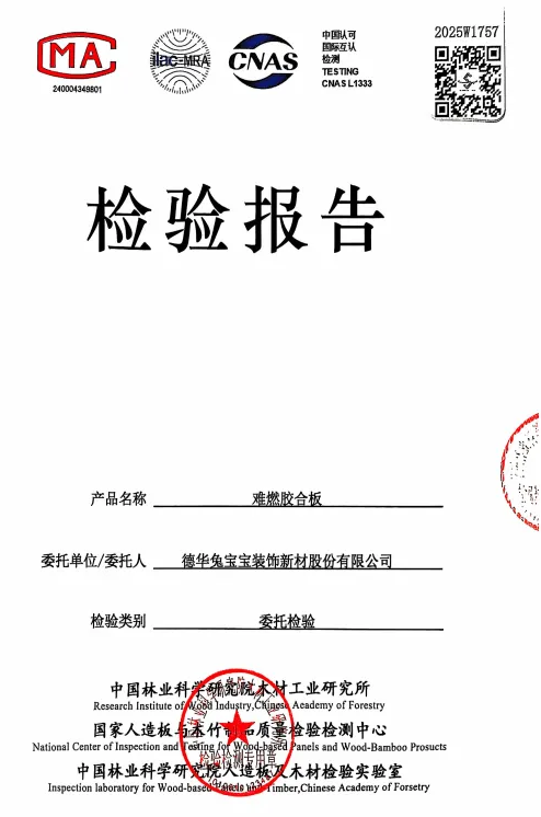 近日,我們已收到國(guó)家防火建筑材料質(zhì)量監(jiān)督檢驗(yàn)中心與國(guó)家人造板與木竹制品質(zhì)量監(jiān)督檢驗(yàn)中心的檢測(cè)報(bào)告。報(bào)告顯示,兔寶寶難燃膠合板在燃燒性能和環(huán)保指標(biāo)上均表現(xiàn)出色,遠(yuǎn)超國(guó)家標(biāo)準(zhǔn),以實(shí)實(shí)在在的數(shù)據(jù)驗(yàn)證了為建筑安全構(gòu)筑生命防線(xiàn)的承諾。