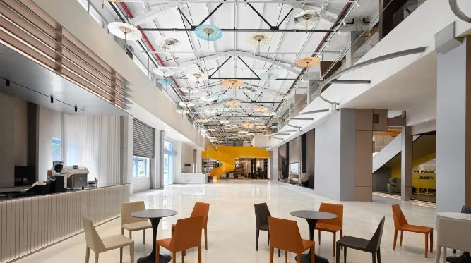 在美學(xué)表達(dá)層面,實(shí)現(xiàn)了歷史底蘊(yùn)與現(xiàn)代設(shè)計(jì)的完美共生。設(shè)計(jì)團(tuán)隊(duì)從工業(yè)遺址中提煉標(biāo)志性的“工業(yè)黃”,并創(chuàng)新性借鑒蒙德里安結(jié)構(gòu)主義色彩哲學(xué),將紅、黃、藍(lán)三原色與溫潤木色進(jìn)行大膽碰撞與平衡。這種色彩語言既延續(xù)了場(chǎng)地的歷史記憶,又以現(xiàn)代設(shè)計(jì)的先鋒視角構(gòu)建起強(qiáng)烈的視覺張力。