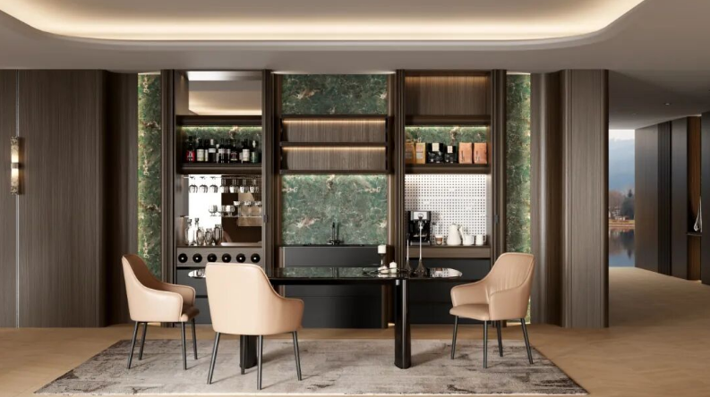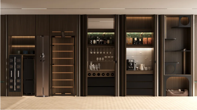 餐邊柜采用一字型布局,結(jié)合開放區(qū)域水槽柜,滿足日常用餐與輕食制作需求??Х裙衽c酒柜作為獨(dú)立的功能模塊,可依據(jù)需求靈活配置于玄關(guān)、客廳或餐廚等不同空間,實(shí)現(xiàn)風(fēng)格統(tǒng)一與功能自由。水吧區(qū)內(nèi)置抽拉臺面,使用時與桌面齊平,有效拓展操作空間,巧妙解決小戶型臺面不足的痛點(diǎn)。