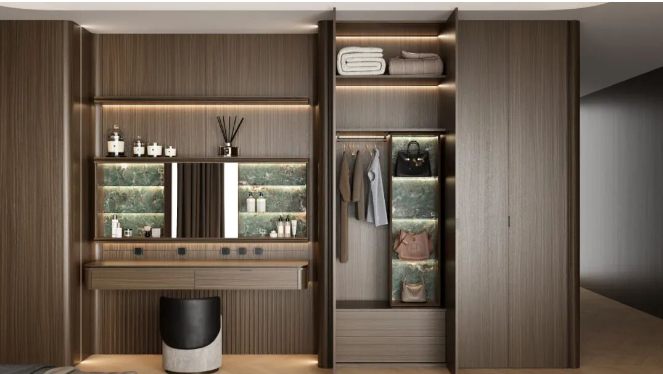 臥室設(shè)置獨(dú)立開放式梳妝區(qū),巧妙利用鏡柜內(nèi)部空間,解決用戶日常使用小電器雜亂無章的收納痛點(diǎn),讓日用梳妝小電器都隱藏于柜內(nèi),干凈整潔又完美隱藏起來。衣柜內(nèi)置旋轉(zhuǎn)柜系統(tǒng),既滿足了年輕女士用戶群體的對于包包的收納需求,又解決了臥室空間難以設(shè)計半身穿衣鏡的使用痛點(diǎn),自由旋轉(zhuǎn),提高用戶體驗(yàn)?;⌒巫o(hù)墻結(jié)合氛圍燈光,營造溫馨高級的睡眠環(huán)境,增強(qiáng)空間視覺沖擊力。
