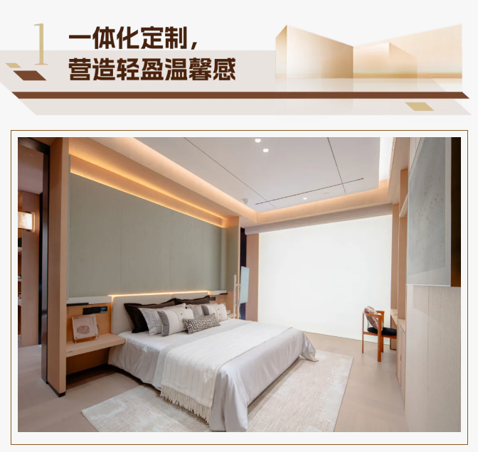 傳統(tǒng)床頭區(qū)域往往是清潔死角,堆積灰塵的柜腳、生硬的墻面轉(zhuǎn)角,無形中增添了空間的壓抑感。兔寶寶好房子采用“床頭柜與背景墻一體定制”的設(shè)計(jì),以懸浮式結(jié)構(gòu)打破厚重印象,不僅讓地面清潔變得輕松自如,更賦予空間輕盈通透的呼吸感?;⌒芜^渡的背景墻設(shè)計(jì),柔化了視線邊界,配合嵌入式暖色燈帶,在入睡前與醒來時(shí)提供溫和不刺眼的光線,營造出包裹感十足的溫馨氛圍。