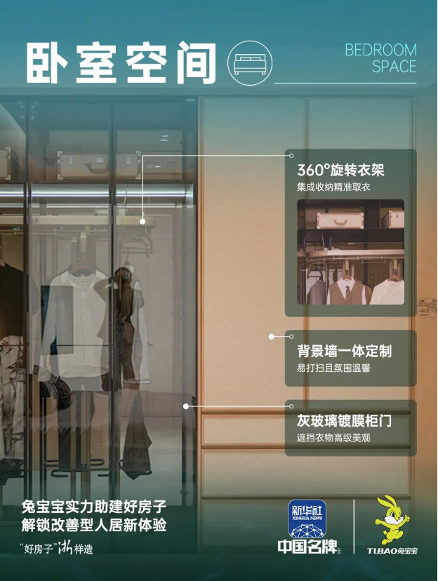臥室衣柜常常面臨兩難:完全封閉顯得沉悶,完全開放則易顯雜亂。兔寶寶好房子選用灰玻璃鍍膜柜門,以朦朧美學(xué)破解這一難題。這既能有效遮擋衣物顏色與形態(tài),避免視覺雜亂,又不像實(shí)木門那樣沉悶壓迫,讓空間保持通透。搭配超窄金屬邊框,柜門在開合之間展現(xiàn)輕奢的線條美感,成為墻面裝飾的一部分。
