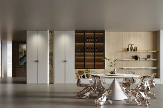 餐邊柜采用“開放展示+封閉收納”分區(qū)設(shè)計,開放格可陳列餐具、綠植點綴空間,封閉柜體則能妥善收納零食、餐巾等雜物,讓用餐區(qū)始終整潔有序。淺色調(diào)自帶空間擴(kuò)容屬性,即便小戶型餐廳,也能從容容納親友小聚,讓每一次用餐都能成為溫馨時刻。