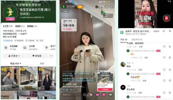 作為兔寶寶在鹽城的一級(jí)經(jīng)銷(xiāo)商,該門(mén)店深耕健康家居板材領(lǐng)域多年,卻也曾面臨傳統(tǒng)線(xiàn)下獲客渠道有限、客戶(hù)觸達(dá)效率低的難題。今年以來(lái),第六空間店瞄準(zhǔn)短視頻與直播的流量風(fēng)口,錨定“每天16:00固定直播”的節(jié)奏,結(jié)合來(lái)客本地生活打造內(nèi)容矩陣:從板材環(huán)保特性講解、全屋定制案例拆解,線(xiàn)下門(mén)店實(shí)景展示,精準(zhǔn)觸達(dá)鹽城裝修業(yè)主,直播間則化身“線(xiàn)上家居顧問(wèn)”,實(shí)時(shí)解答用戶(hù)關(guān)于板材選擇、定制方案的疑問(wèn)。接地氣的內(nèi)容輸出與專(zhuān)業(yè)的講解服務(wù),讓兔寶寶鹽城第六空間店快速積累了線(xiàn)上口碑。