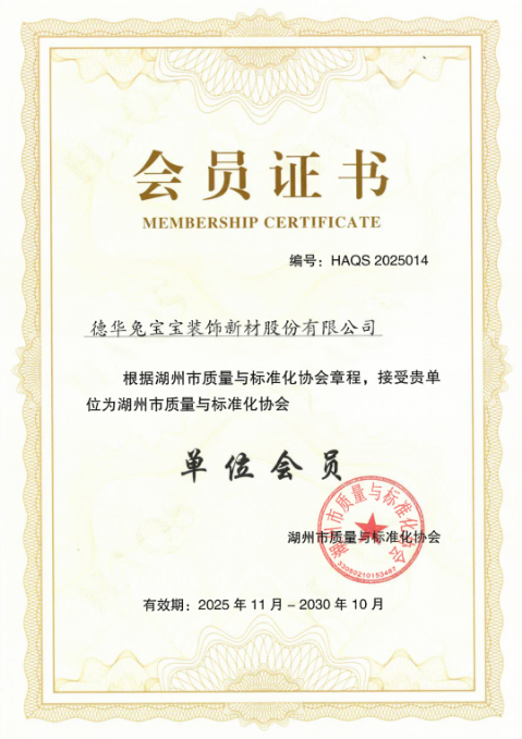 2026年1月9日,湖州市質(zhì)量與標(biāo)準(zhǔn)化協(xié)會(huì)成立大會(huì)暨第一屆理事會(huì)在湖州召開(kāi),標(biāo)志著湖州質(zhì)量與標(biāo)準(zhǔn)化領(lǐng)域發(fā)展邁入?yún)f(xié)同推進(jìn)、規(guī)范提升的新階段。德華兔寶寶裝飾新材股份有限公司憑借卓越的質(zhì)量管控水平及標(biāo)準(zhǔn)化建設(shè)成果,當(dāng)選協(xié)會(huì)第一屆理事單位。