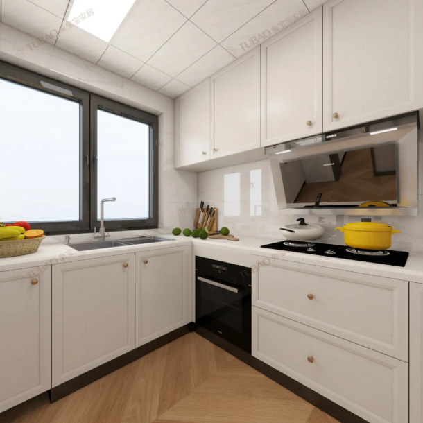 全柜采用奶油白啞光材質(zhì),徹底弱化了廚房常見的冰冷感,讓烹飪空間也滿是溫馨。黃銅拉手與黑色家電形成巧妙點綴,在柔和的基調(diào)中增添了質(zhì)感層次,讓空間復(fù)古而不沉悶。吊柜與地柜的合理搭配,打造出充足的收納空間,讓鍋碗瓢盆各歸其位,兼顧美學(xué)與實用。