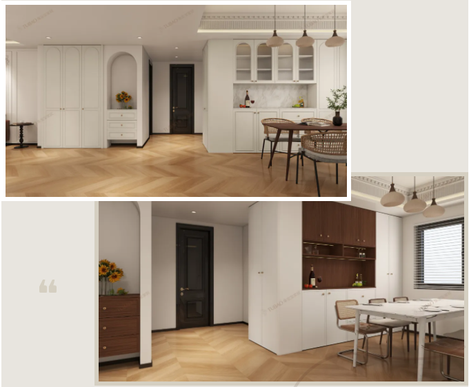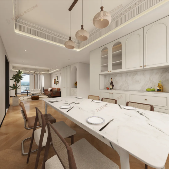 大理石紋餐桌與奶油白柜體形成冷暖交織的配色,既有石材的質(zhì)感加持,又不失奶油風(fēng)的溫柔。餐邊柜采用“開放格+封閉格”的組合設(shè)計,開放格擺放常用餐具與精致擺件,方便取用又具展示效果;封閉柜則收納不常用物品,讓空間保持整潔有序。黃銅拉手作為點睛之筆,悄然呼應(yīng)中古風(fēng)的雅致,為空間注入細膩的復(fù)古韻味。
