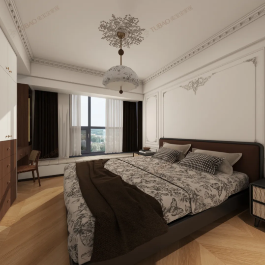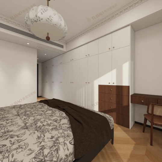 全空間采用暖色調(diào)搭配淺木色人字拼地板,從根源上弱化了空間的冷硬感,盡顯溫馨柔和。復(fù)古造型的吊燈是空間的視覺焦點,暖光散發(fā)的光暈更能營造出靜謐安穩(wěn)的睡眠氛圍。整面奶油白嵌入式衣柜,將收納功能與風(fēng)格統(tǒng)一完美融合,實現(xiàn)了功能與美學(xué)的平衡。
