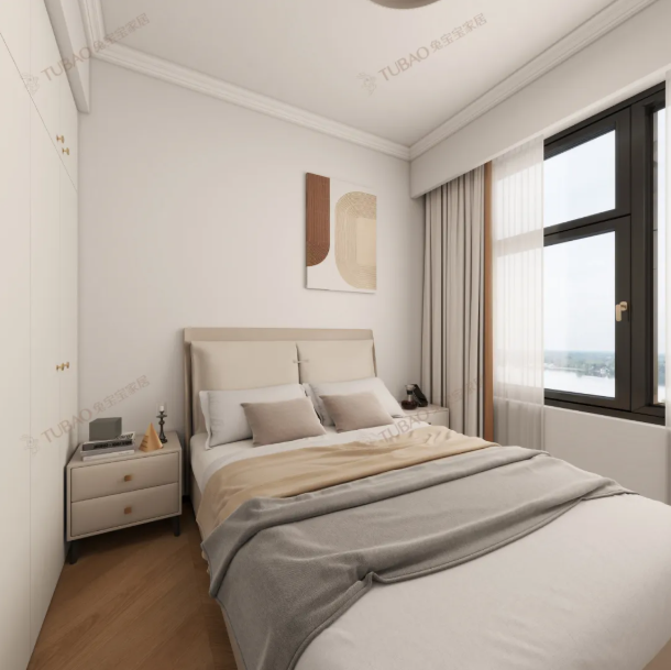 次臥雖面積小巧,卻絲毫未減溫馨質(zhì)感,延續(xù)了主臥的簡約基調(diào)與溫暖氛圍,同時最大化利用每一寸空間,實現(xiàn)了休息與收納的雙重需求??臻g以奶油白與淺木色為主色調(diào),色彩與材質(zhì)的統(tǒng)一讓整體感更強;雙層柔紗簾的選用頗具巧思,既能保障私密,又能讓自然光線變得柔和舒緩,材質(zhì)自帶的柔感與奶油風(fēng)的松弛調(diào)性不謀而合,讓小空間也滿是治愈感。