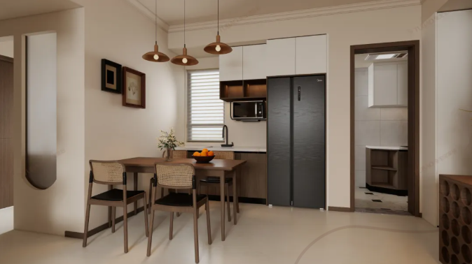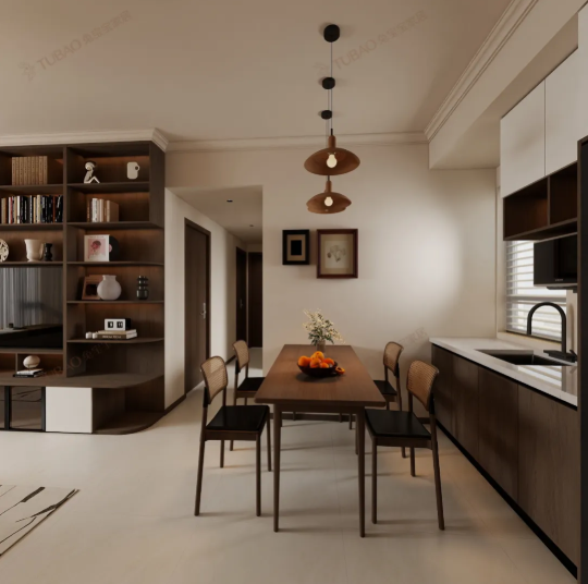暖調(diào)的淺米色墻面裹著溫柔的光,用淺棕木紋餐桌搭藤編椅,自帶復(fù)古松弛感;暖棕吊燈配低飽和墻色,把復(fù)古調(diào)壓得溫和不厚重。旁邊的櫥柜一半是奶白一半是淺棕,嵌著微波爐的設(shè)計省了不少空間,黑色冰箱穩(wěn)穩(wěn)立在旁,和門框的深棕線條呼應(yīng)。連墻上的畫框都透著輕簡的溫馨,在這兒吃飯,連日常都裹著軟乎乎的暖意。