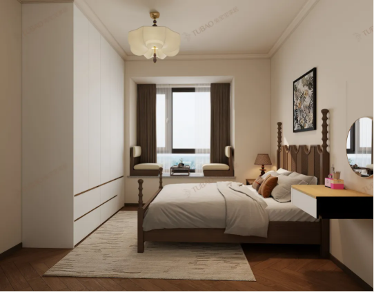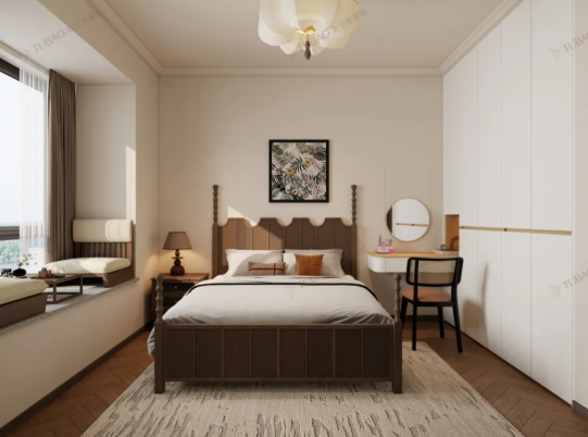 深棕木質(zhì)四柱床帶著經(jīng)典的雕花線條,是整個空間的復(fù)古亮點;墻面選了低飽和的暖米色,配上人字拼木地板,暖調(diào)基底剛好襯出溫柔。