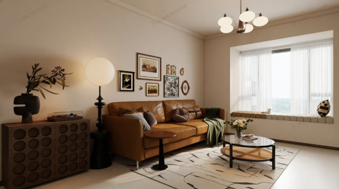 棕色皮質(zhì)沙發(fā)質(zhì)感醇厚,搭配黑色圓形茶幾,再以藤編元素點綴其間,勾勒出慵懶松弛的會客氛圍。沙發(fā)旁立著精致斗柜,一盞落地?zé)魞A瀉暖光,光影交錯間,中古風(fēng)的雅致與愜意悄然彌漫。