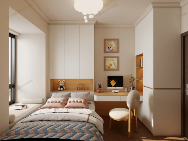次臥整體用淺白 + 暖木色打底,靠墻做了一體化的柜床 + 書桌,衣柜藏在上方省空間,床頭嵌入的開放格剛好放玩偶、小擺件,旁邊連桌的書桌能直接當(dāng)學(xué)習(xí)區(qū),側(cè)邊還留了小書架放書本,動線很順。