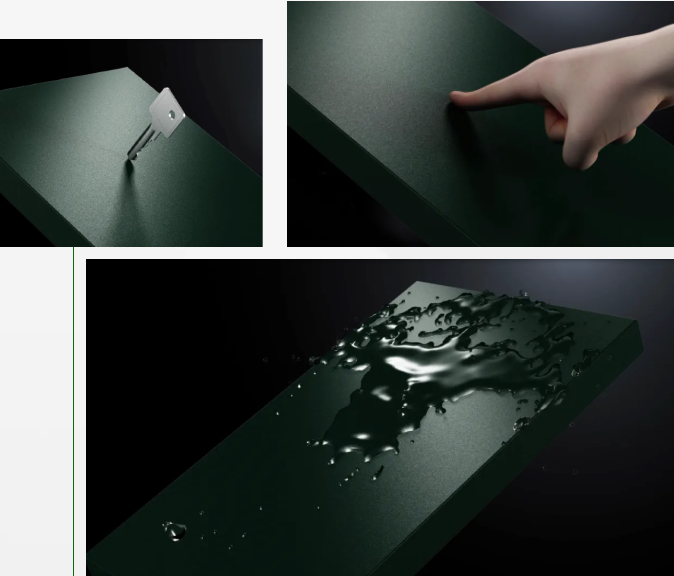 零醛水漆板表面硬度達3H以上,具備抗劃痕、耐龜裂、耐黃變等特性,從容應(yīng)對南北氣候差異;防指紋、耐油污的實用優(yōu)勢,讓醬油、咖啡等日常污漬一抹即凈,大大減輕清潔負擔(dān)。配合R0.5極致小角度包覆工藝,實現(xiàn)門墻柜無縫銜接,邊角細膩順滑,盡顯高端質(zhì)感。