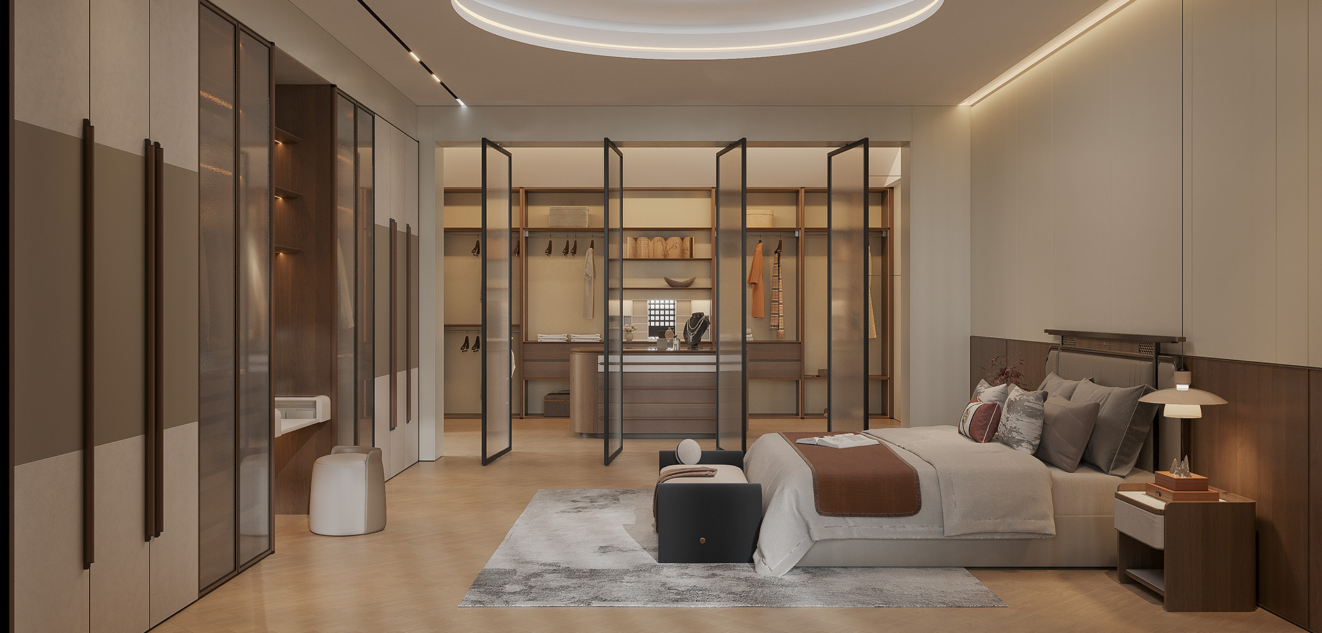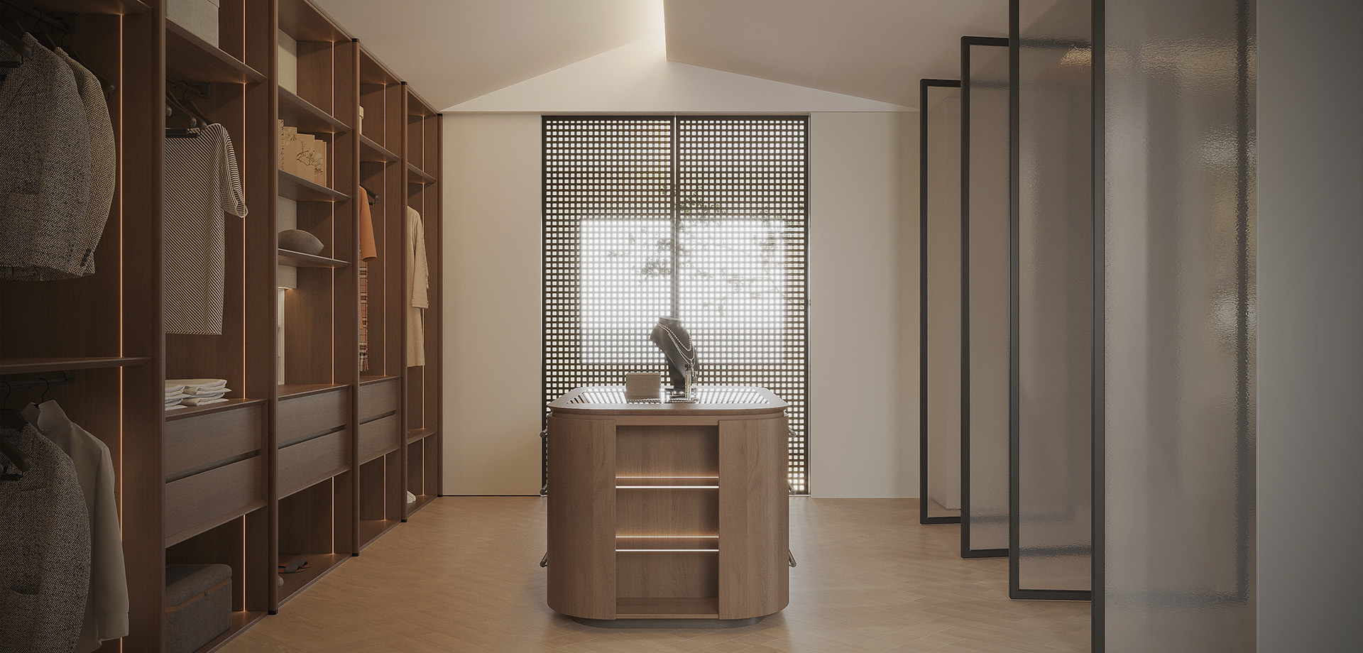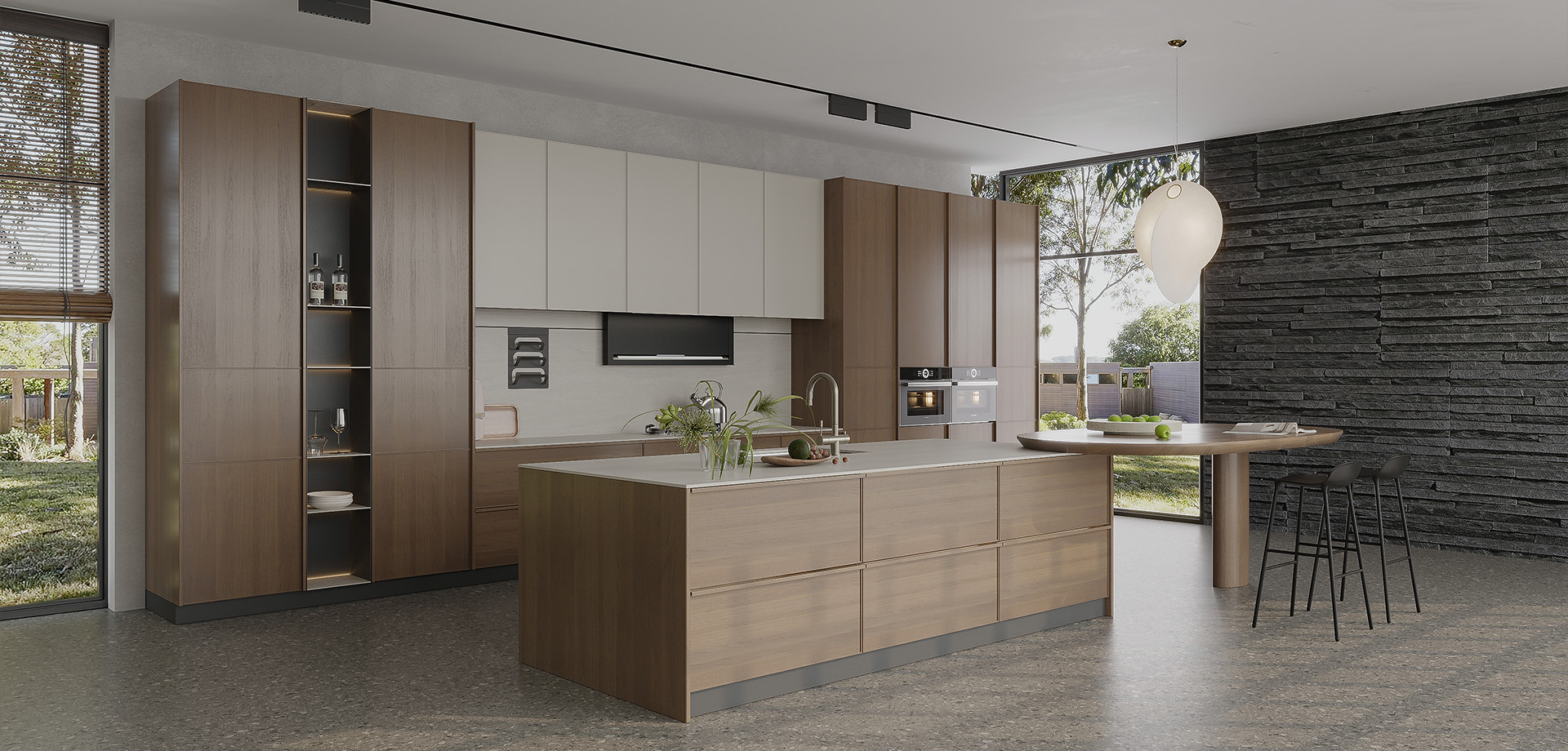 以木色為主導(dǎo),簡(jiǎn)致的柜體立面及利落的線條切割,帶來輕盈而溫和的情緒導(dǎo)向。