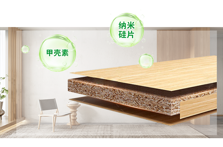 板材飾面層添加長效凈醛粒子——甲殼素與納米硅片,能夠有效吸附空氣中的游離甲醛,并將甲醛分解為水分子與無毒無害的“肟”,所產(chǎn)生的“醛凈力”實現(xiàn)360°清除室內(nèi)甲醛、凈化空氣的效果,除醛更徹底。