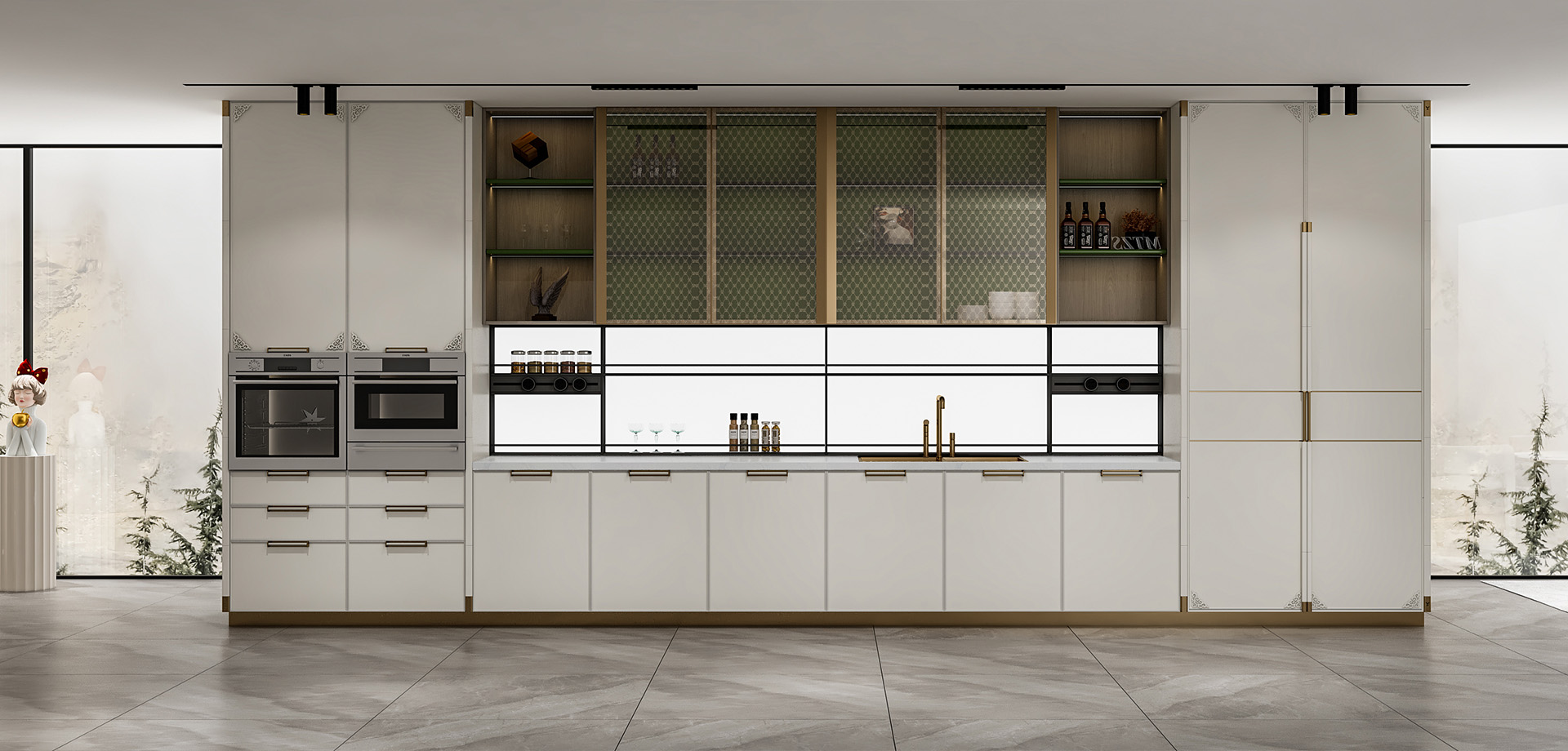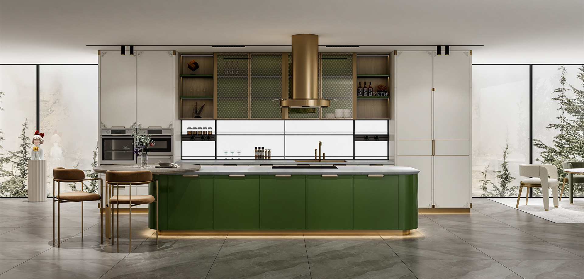 開放式廚房+島臺(tái)+玻璃吊柜的經(jīng)典搭配