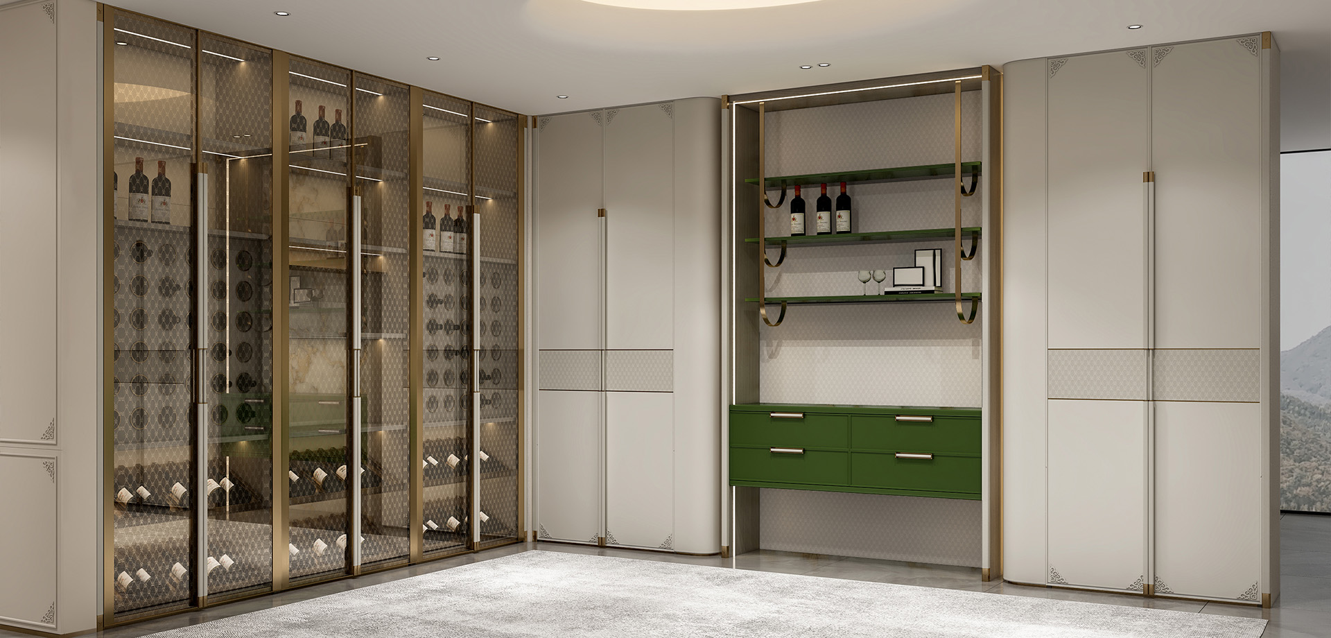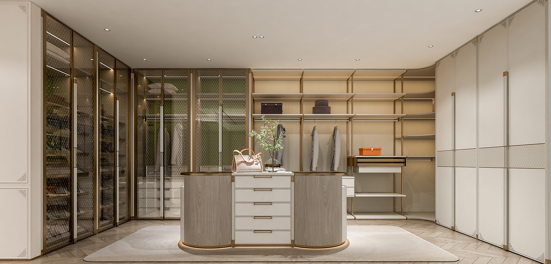 舍棄繁復(fù)的外觀造型,突出中軸線的對(duì)稱,低調(diào)淡雅的色彩結(jié)合金屬材質(zhì)塑造出來的空間感體現(xiàn)法式情懷的浪漫。