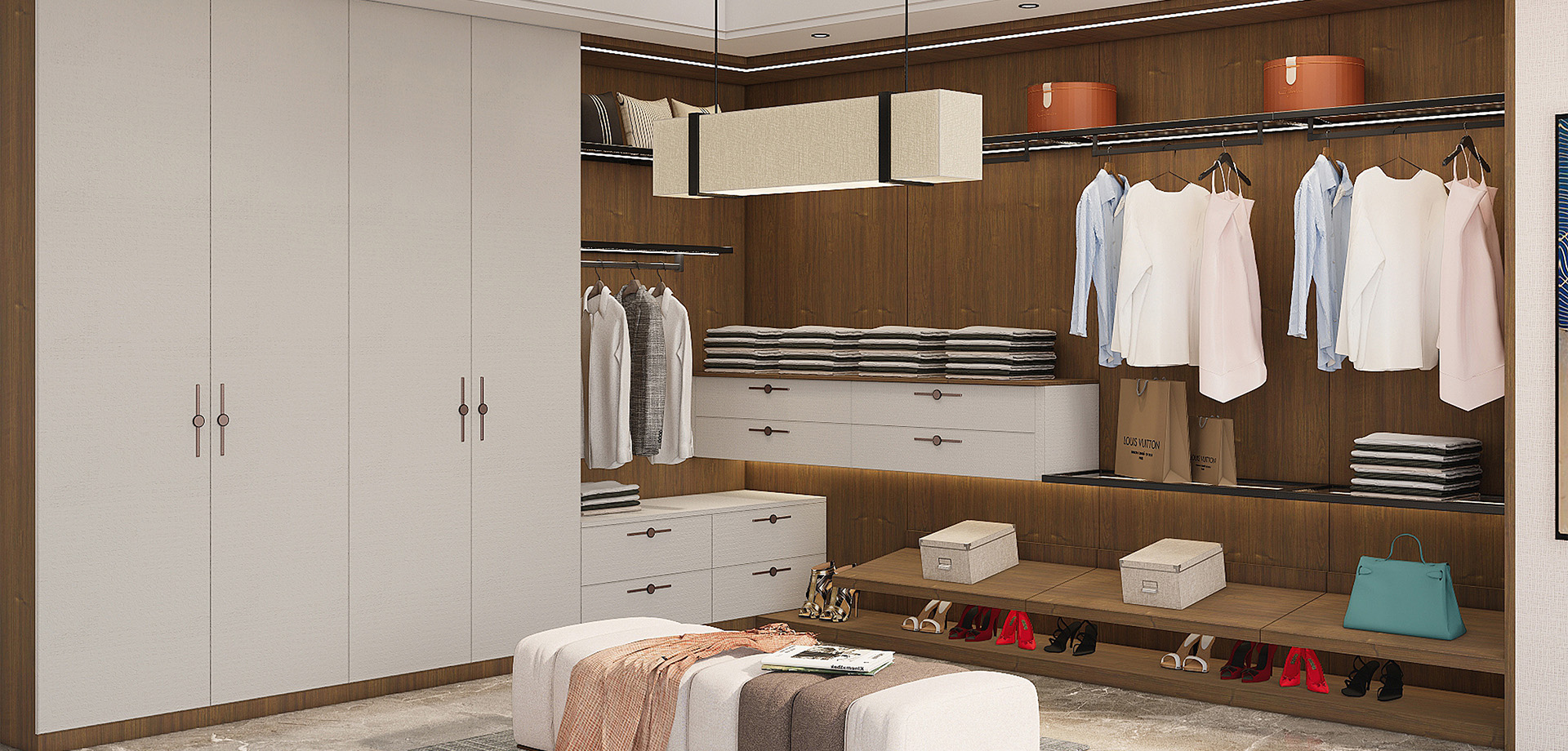 衣帽間以白色及亮彩色為空間底色,純凈、靈動(dòng)。