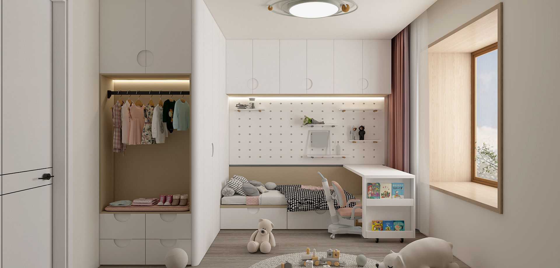 兒童房采用L型布局的設(shè)計(jì),集睡眠、學(xué)習(xí)、收納于一體。